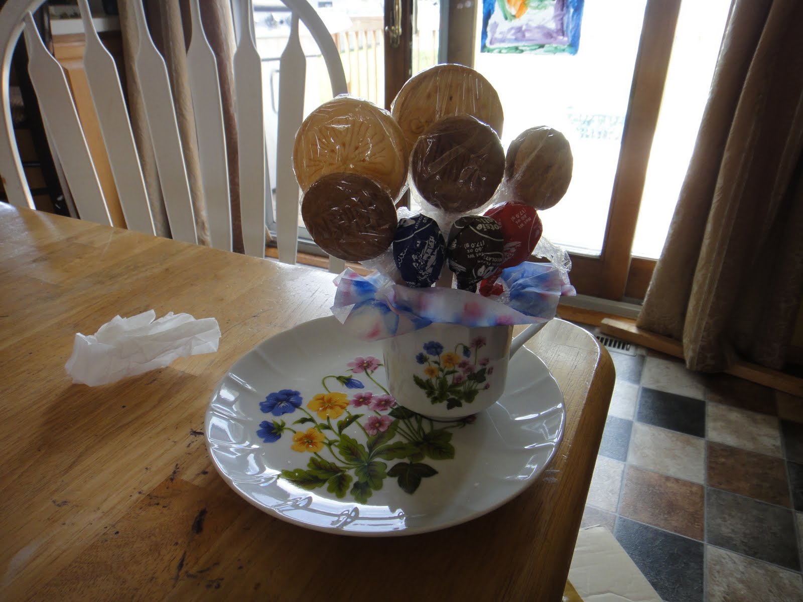 I am excited about our Mother's Day craft tonight. I had bought some old teacup and saucer sets when the service unit was trying to decide what to do for Thinking Day. We ended up not using them and that left me with 9 sets to find a use for. I also have left over GS cookies my troop paid for to use up, so I'm throwing them into the mix. I decided to try making teacup bouquets with the girls.